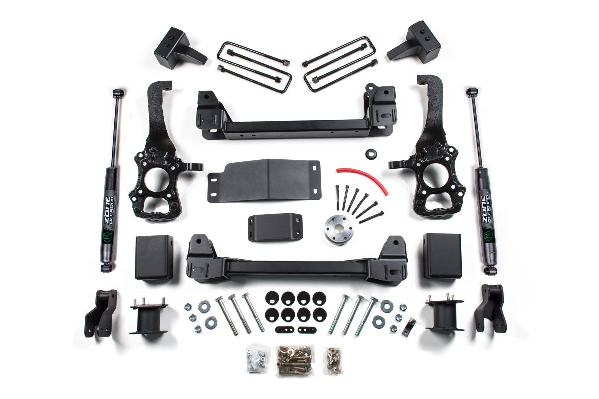 The Zone Offroad 4-inch Lift Kit for the 2015–2020 Ford F-150 4WD delivers added clearance and everyday practicality, supporting up to 35-inch tires while maintaining solid on-road handling. The lift is built around precision-engineered ductile iron steering knuckles made in the USA, which properly correct suspension geometry at the raised ride height. The kit also includes heavy-duty crossmembers, a differential drop, sway bar drop brackets, a skid plate, rear lift blocks, and new U-bolts for a complete, properly engineered suspension upgrade. Front configuration options allow you to retain factory struts via strut spacers or replace the front struts entirely with Zone Nitro loaded struts. Rear shock options include Zone Nitro or FOX 2.0 Adventure Series shocks. The 4-inch rear blocks retain some factory rake for those who prefer a slightly higher rear stance for hauling or towing.