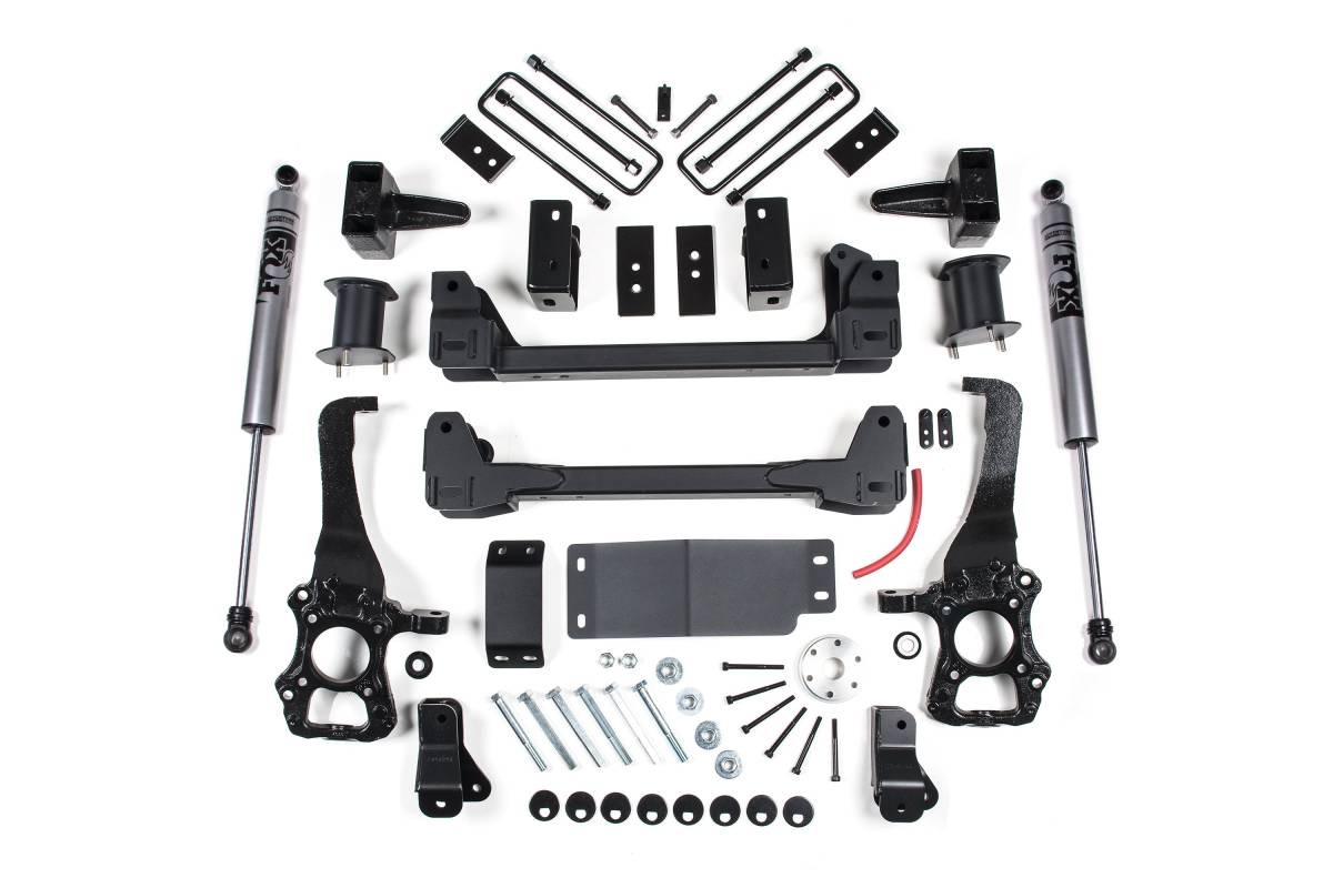 This 6-inch lift kit from Zone Offroad is designed for the 2015–2020 Ford F150 4WD. The kit includes high-strength crossmembers, ductile iron steering knuckles, strut spacers or loaded strut options, and a rear block kit to lift and level the stance. Clearance for up to 37-inch tires is achievable with this kit.