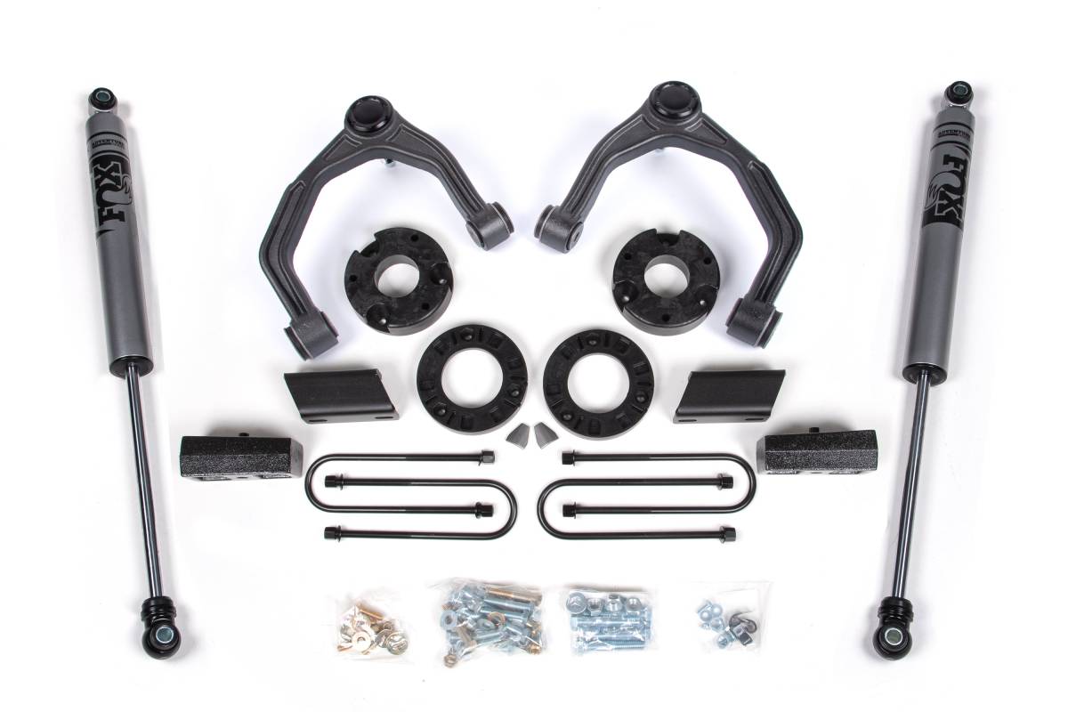 This variant uses a front strut spacer for 3.5" of front lift paired with FOX Adventure Series rear shocks and a 2" cast lift block for 2" of rear lift. The FOX Adventure Series shocks feature a nitrogen-charged twin-tube design with 10-stage velocity-sensitive valving, dual-welded ends, self-lubricating seals, a 2-inch diameter steel body with black powder coat finish, and application-specific valving for maximized performance.