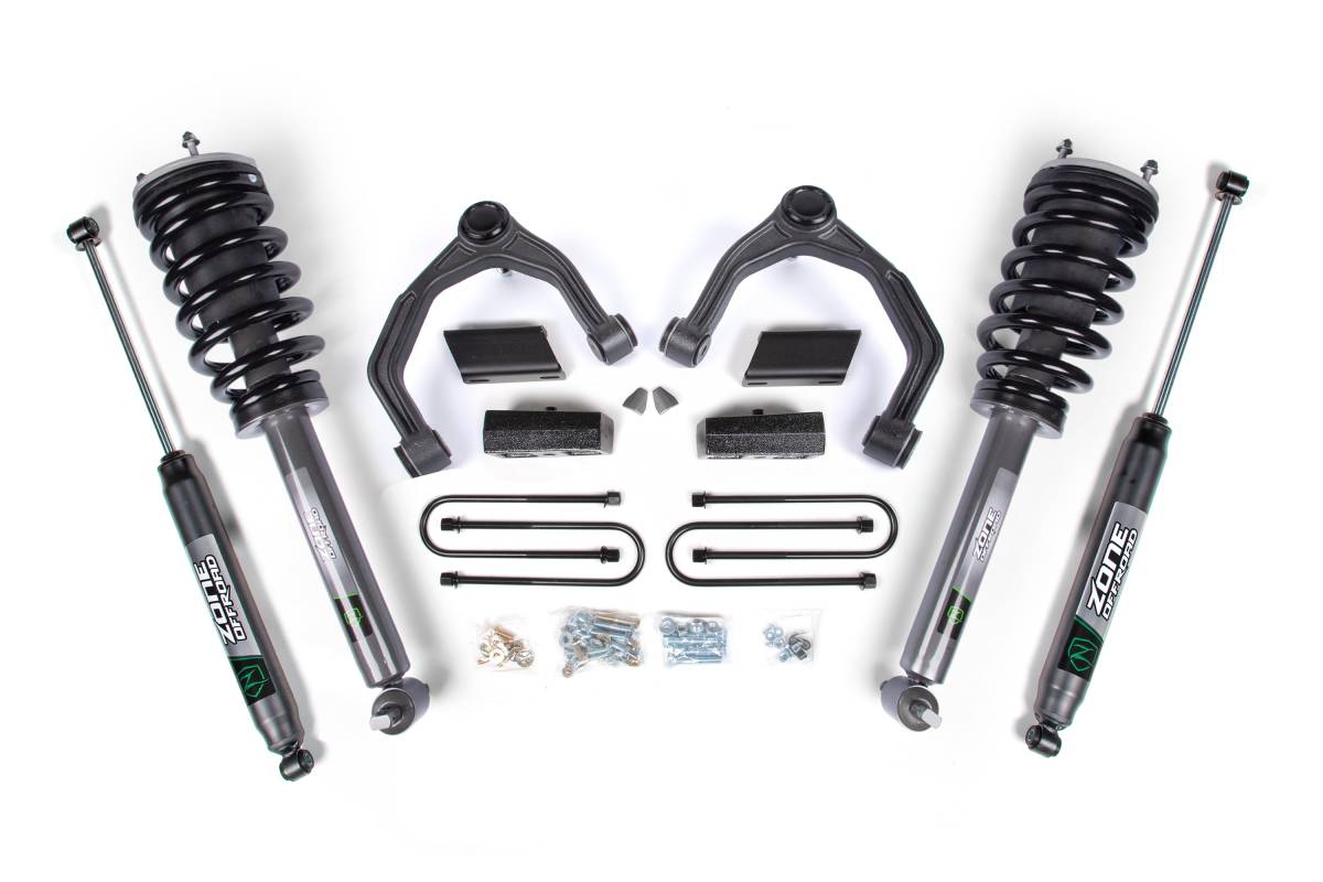 The Zone Offroad 3.5" Adventure Series lift kit goes beyond a standard leveling kit by incorporating Adventure Series upper control arms (UCAs) for improved off-road performance and increased suspension travel, with clearance for up to 35" tires. Front lift is achieved through a 2-piece combination top-mount and preload strut spacer design that delivers a full 3.5" of lift without overextending the suspension at full droop. Optional weld-in steering stops are included to support up to 35" tire fitment. The rear is lifted and leveled with a cast 2" lift block.