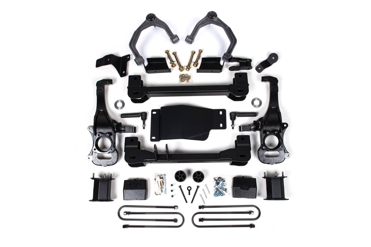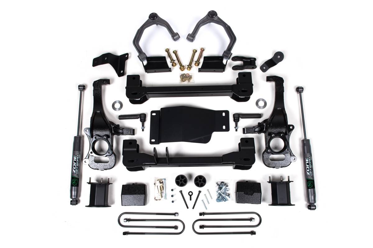 This 6" lift kit from Zone Offroad is designed for the 2025–2026 Chevy Silverado 1500 and GMC Sierra 1500 4WD. The kit includes high-strength crossmembers, steering knuckles, differential relocation brackets, and Adventure Series upper control arms to improve suspension geometry and provide clearance for up to 35" tires. Multiple front and rear shock configurations are available to suit different ride quality and performance preferences.