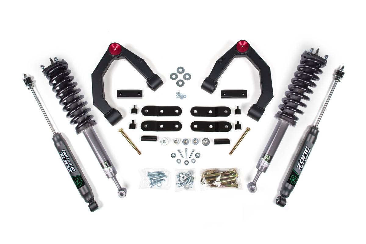 This configuration uses a loaded strut replacement up front (3.5" lift) and Nitro Series rear shocks with a block lift for 1" of rear lift. The Nitro Series shocks feature an internal floating piston (IFP) monotube design, a large 5/8-inch hard chrome plated heat-treated alloy steel shaft, race-developed high-flow piston design, application-specific valving, and a long-lasting clear anodized finish.