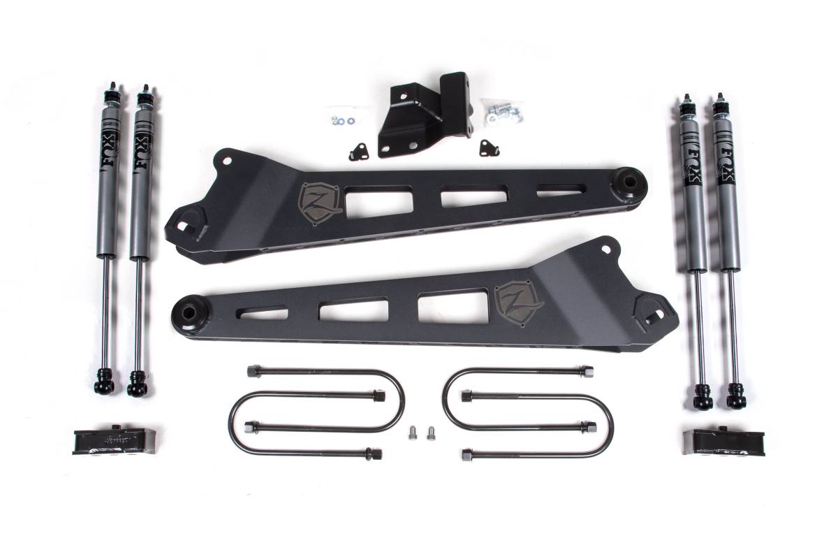 Up front, progressive rate coil springs are engineered to support the added weight of the diesel platform. Zone Offroad replacement fabricated radius arms correct caster after lifting and improve suspension geometry and long-term durability. A track bar relocation bracket re-centers the axle for optimal steering precision and alignment. Sway bar links and brake line brackets are also included.